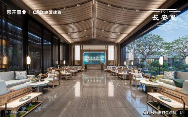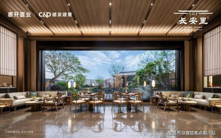 站在售楼处约9.6米宽、约3.5米高的落地窗前,错落有致的亭廊和山石叠水相互交织,宛如徐徐展开的山水画卷,在这喝一杯茶,江南诗意生活尽显。