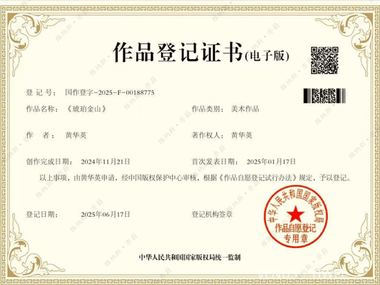 以上《琥珀金山》为维纳斯·亦蔚所有权的作品登记证书,侵权必究!