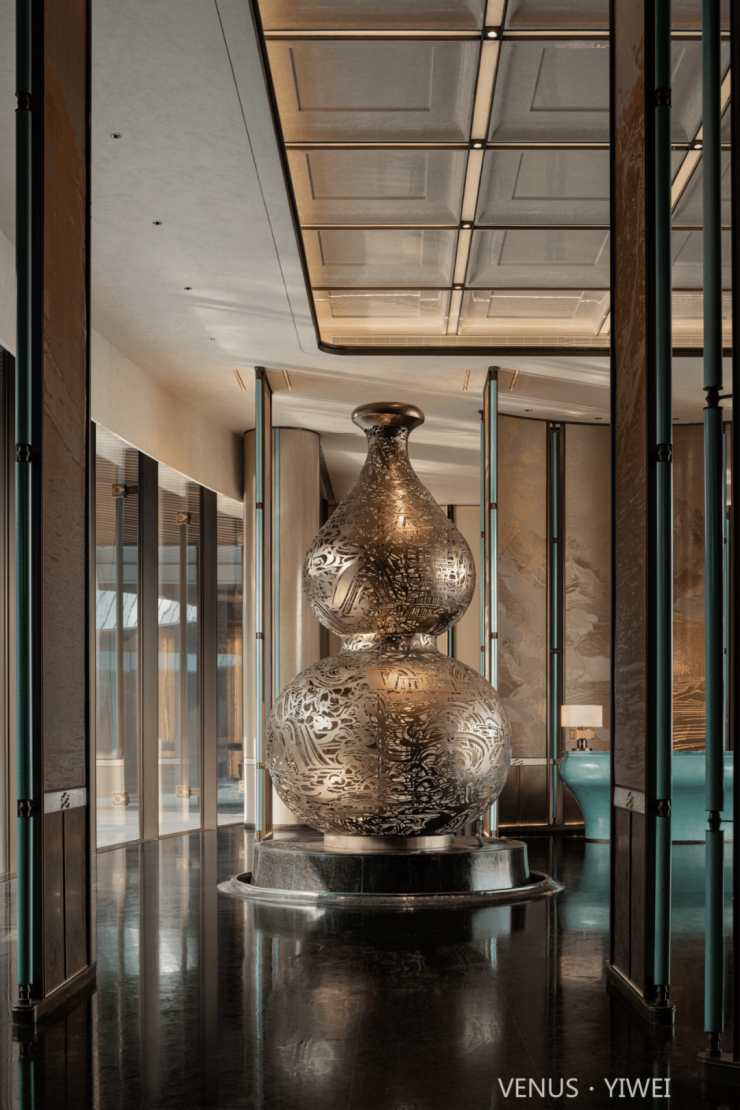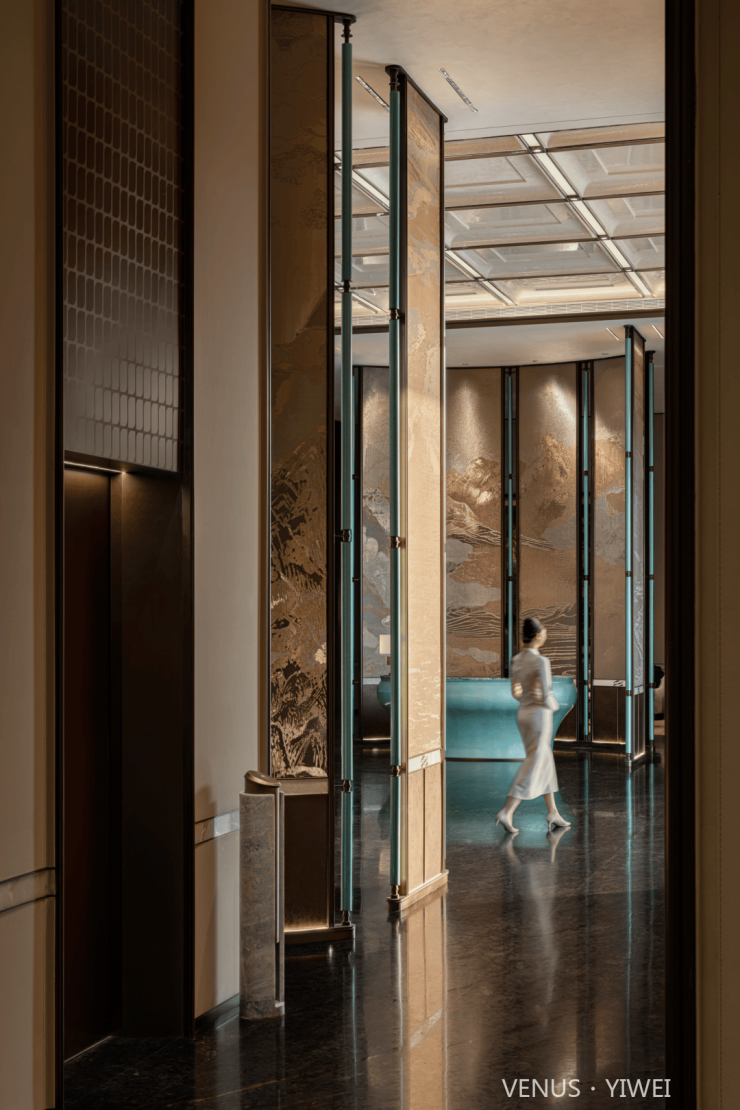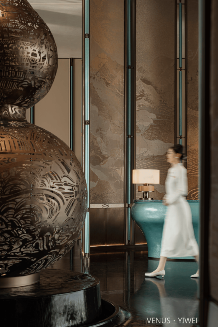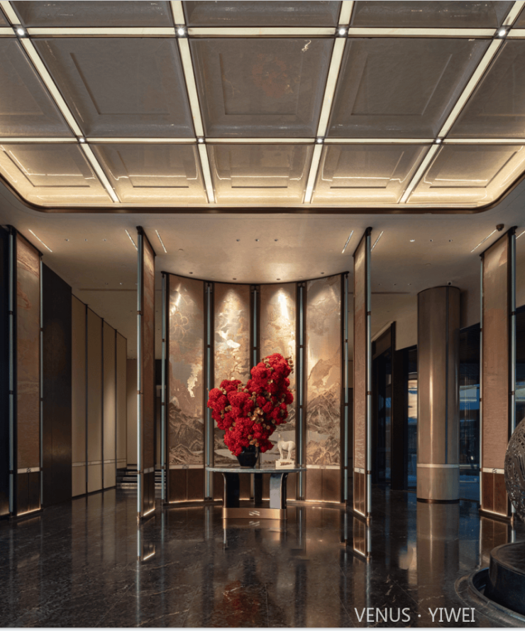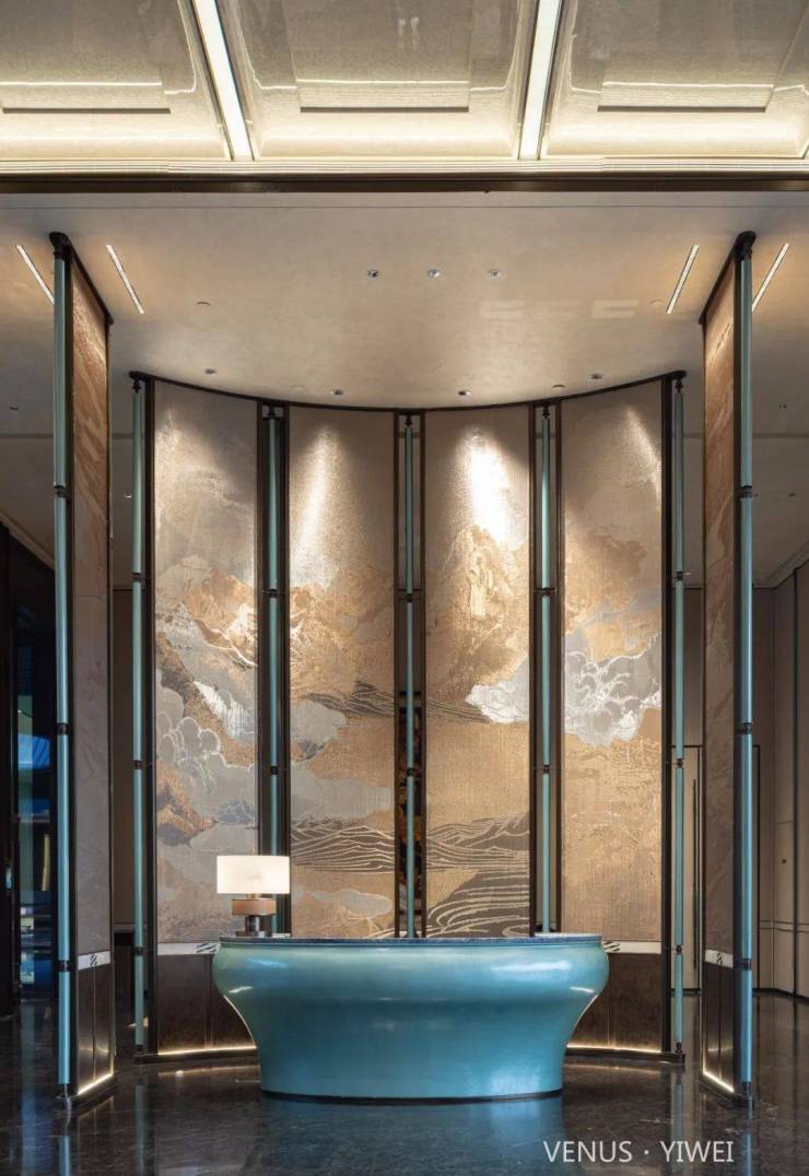 整牆金珀凝天地氣韻,億載流光淬為峰巒肌理。金紅霞色隨光漫溢,層疊如龍脊盤亙、山河湧動。背景牆承東方祥瑞 —— 琥珀紋脈藏歲月金玉,巨幅「金山」融空間氣象,令福祿隨光影流轉,富貴與時光共生。