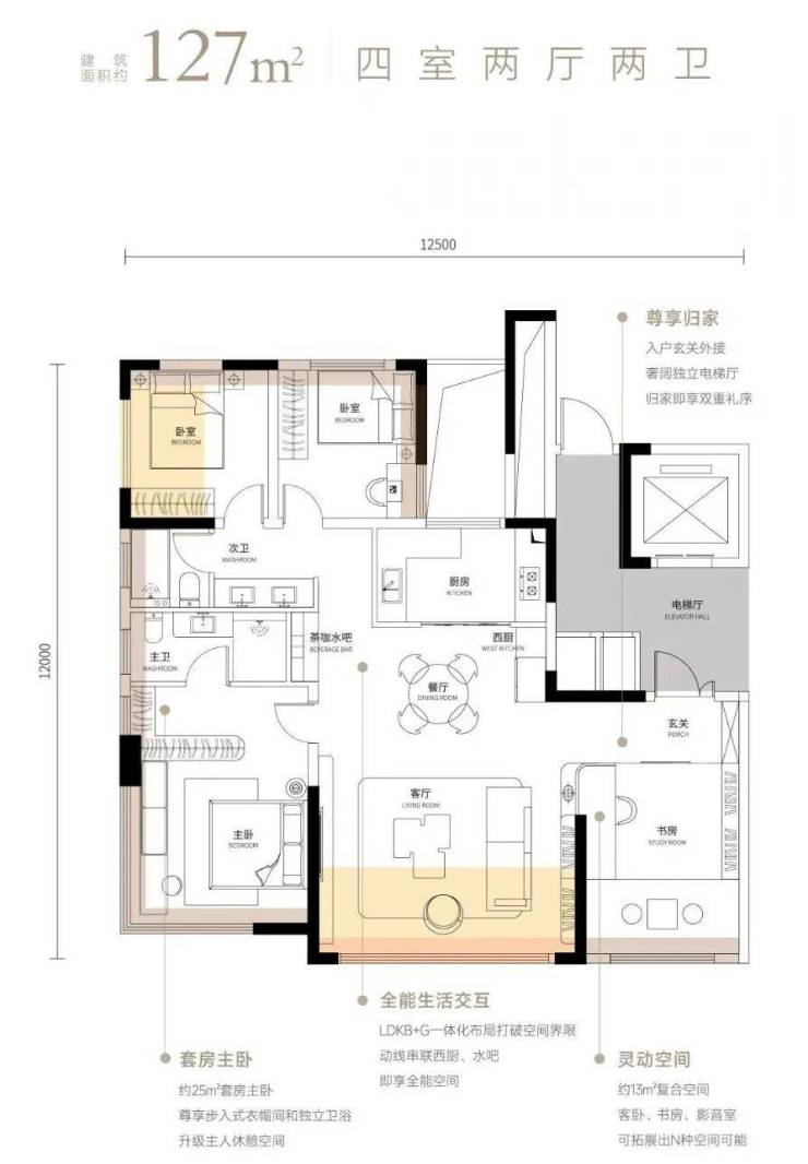 也就是说哪怕建面127㎡,也能做到真四房设计,无论是三代同堂,还是二胎家庭,这个户型完全够用。