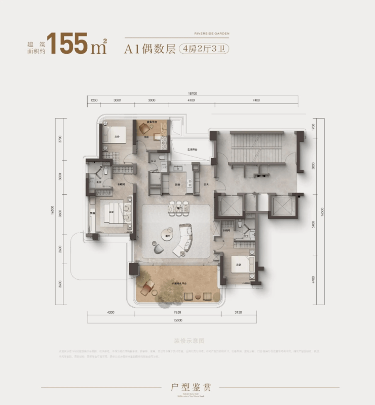 建面约 155 ㎡ A1 户型,以超越尺度的想象,承载媲美 200 ㎡的生活格局。约 7.65 米南向大宽厅与餐厨一体贯通,更配置 270 ° IMAX 环幕视野,打破空间隔阂,延展更多生活场景;打造约 27 ㎡的阔景露台,观景、种花、品茶……展开一场与自然的亲密对话。