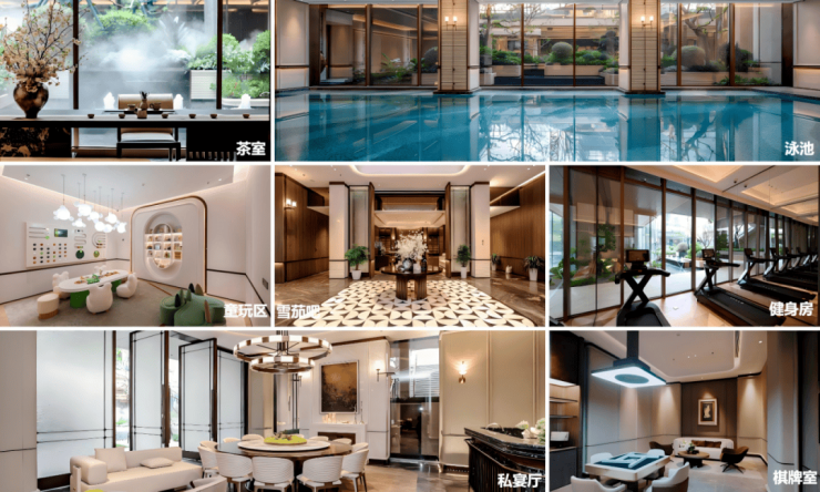 项目配备了约 2200m ²下沉式会所,配置恒温泳池、私宴厅、雪茄吧、健身房、棋牌室、茶室等多种高阶生活情境,一个承载高端圈层社交属性的 “ 私家主场 ” 缓缓展开。