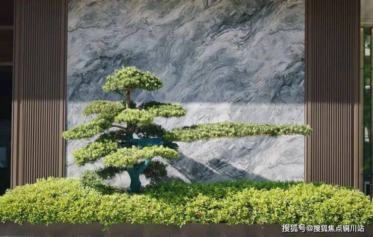 保利的诚意从入门就铺陈开来:阔奢的大门搭配极具造型感的罗汉松,主墙面采用岩板搭配暖色金属条,整体造型沿用古代屏风设计,光与影的跃动之下,实现尊贵的落客体验。