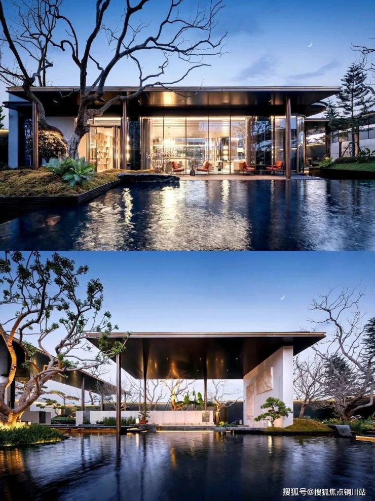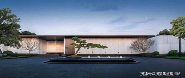 入口视角是设计中不可或缺的部分,设计师选用了一张蓝调时刻的影像,以完整展现入口空间的魅力。踏入门厅,粗糙的材质质感格外引人注目,色彩的深浅对比营造出独特的氛围。设计师在底部设置了镂空设计,并搭配置石流水的小景,与墙面材质肌理相互呼应,色彩对比鲜明,视觉延续性极强。景石的视觉元素贯穿整个空间。