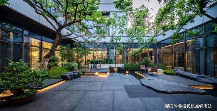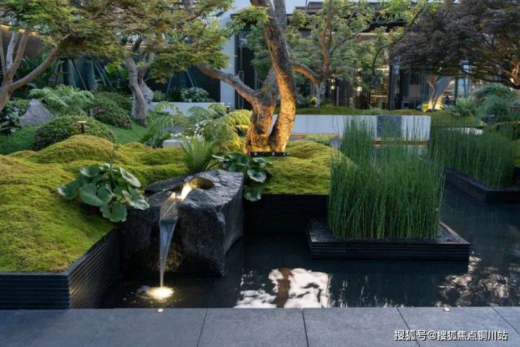 二进空间以流水景墙和景观装置为主题。下沉庭院中,午后阳光透过树木洒下,形成斑驳的光影效果,极具质感。夕阳照耀下的后场廊架,呈现出一种美的层次感,重点突出了光影下廊架墙体的序列感。