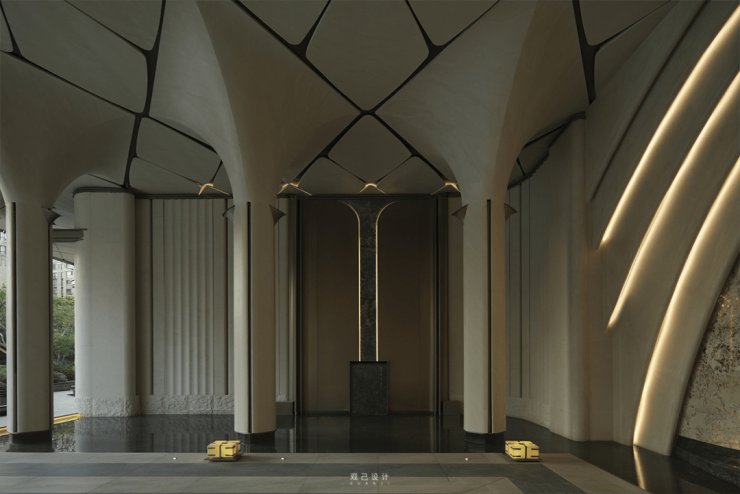 门楼内提取线条与门柱融合,仿佛是一股气韵将屋檐向上托举,提取自苏州砖雕窗花的形态,极致的线条交错下,在摩登感中融入苏州古建特有的灵动韵味。