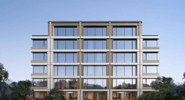 建筑设计:大面积玻璃幕墙搭配银灰色及香槟金色铝板,呈现出温润质感,“超纤细” 线条勾勒,提升建筑整体的精致感与现代感。