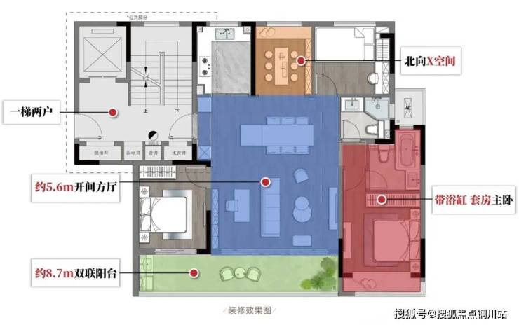 尤其是约8.7米双联跑道式阳台串联约5.6米奢阔方厅,LDKB一体化布局下,视野和采光拉满!