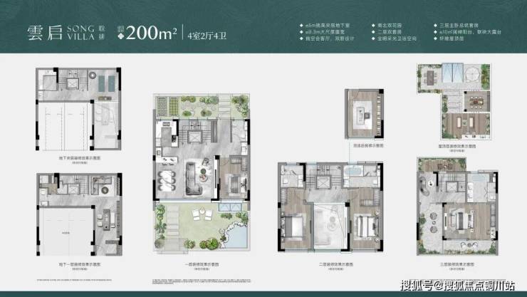 最后来说说叠墅户型,开发商摒弃市场上5-6层叠加的困局,设计更大化私密尊享空间的4层叠加,上下叠均配地下室,并赠送大面积挑空: