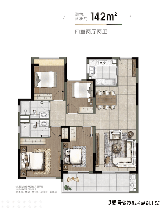 项目还有142平四房,可看作135平Plus版,公区更大,空间和尺度感更阔绰,双联大阳台,采光观景面很赞,大家庭改善家庭别错过。