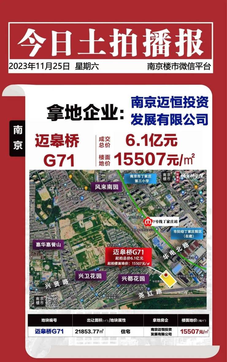 花语伴山所在地块,在2023年11月25日土地拍卖中,被南京迈恒投资发展有限公司底价6.1亿元拿下,成交楼面地价15507元/㎡。