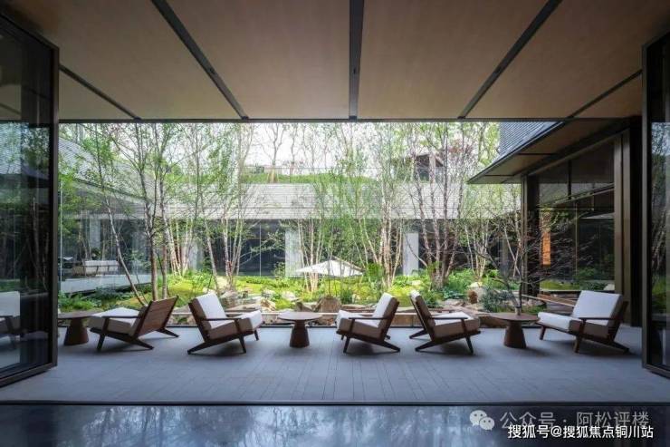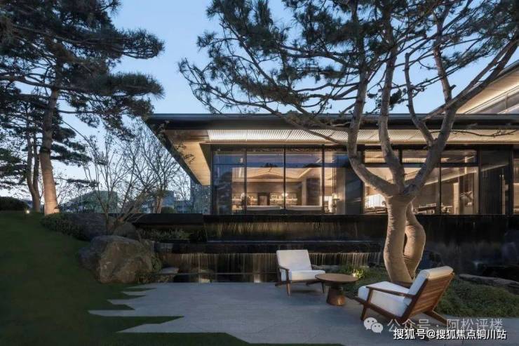 再往里走,所见即是招商天青府高大上的社区会所。传统坡屋顶与现代中空超白玻璃结合,双层叠水泉鸣瀑响,舒缓清幽,过滤喧嚣。