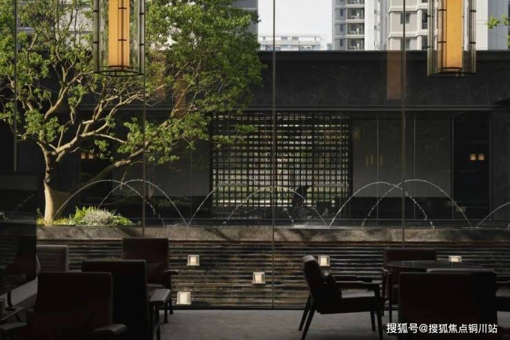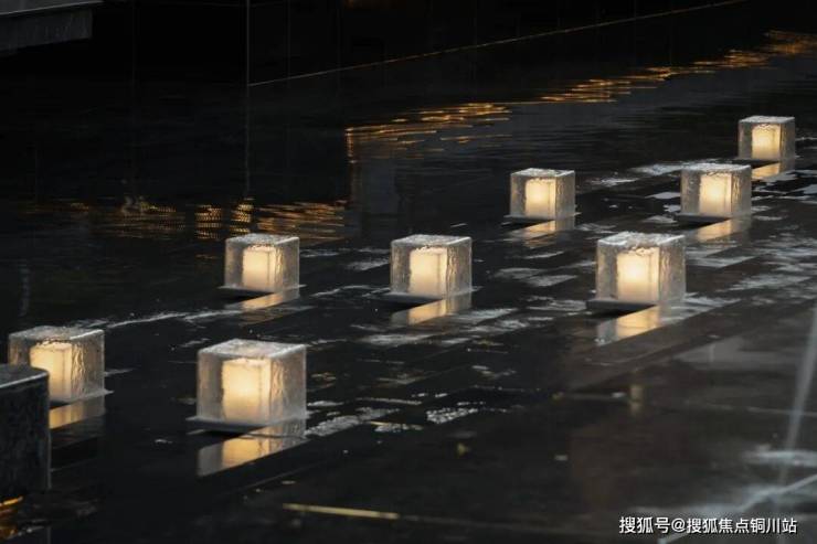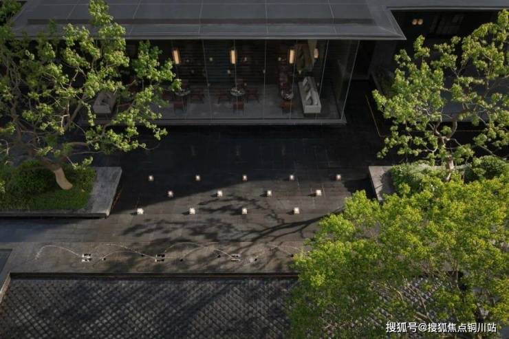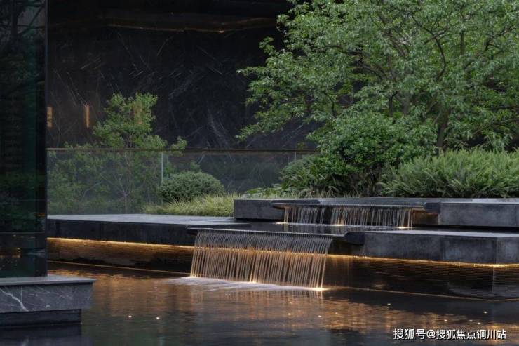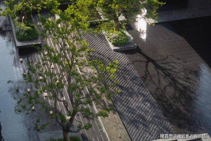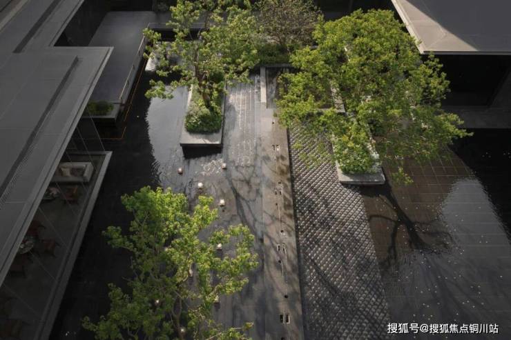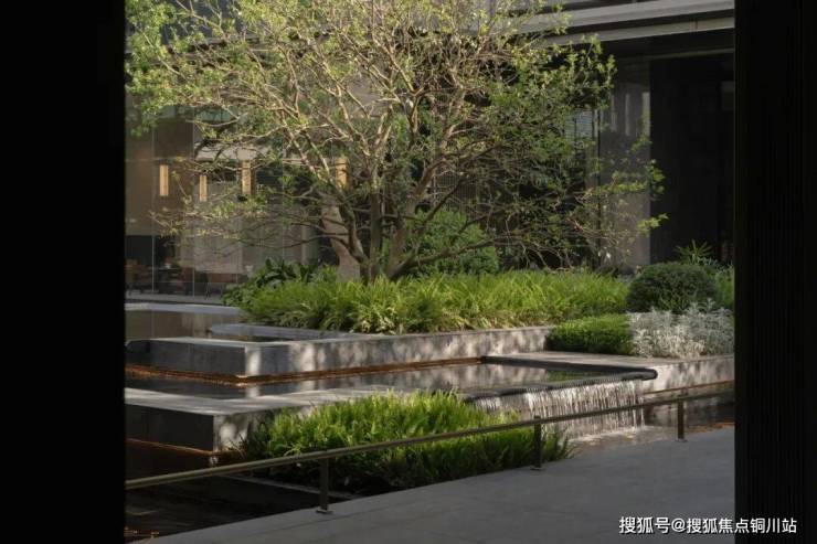 水体包裹菱形面,晶莹斑驳,似水柔和如绢布滑落,双影跳泉在高低层级不同的绿化环境内灵动跳跃,形成合院视线焦点,将绿意与水的灵性在温和中饱含力量。
