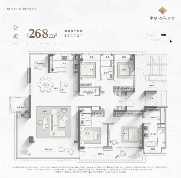 除了目前已公开的建面约190㎡和建面约235㎡的样板间外,中建·合玺东方还有建面约268㎡的更大面积段的户型产品,露台端厅也是一样不落,更奢阔的空间尺度,更加能够提升生活品质和居住体验。