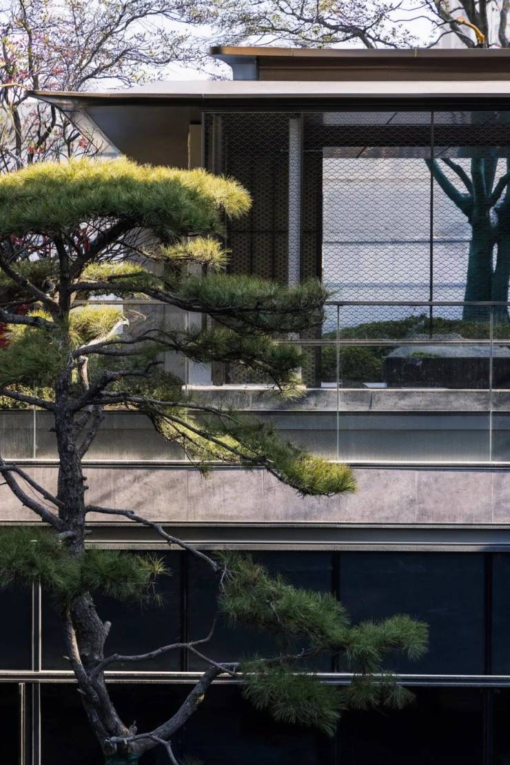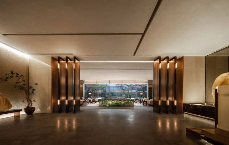 游走于廊下,一侧是仿若深涧幽谷的下沉庭院,一侧是朦胧影绰的扇纹格栅笼罩着林泉清音。