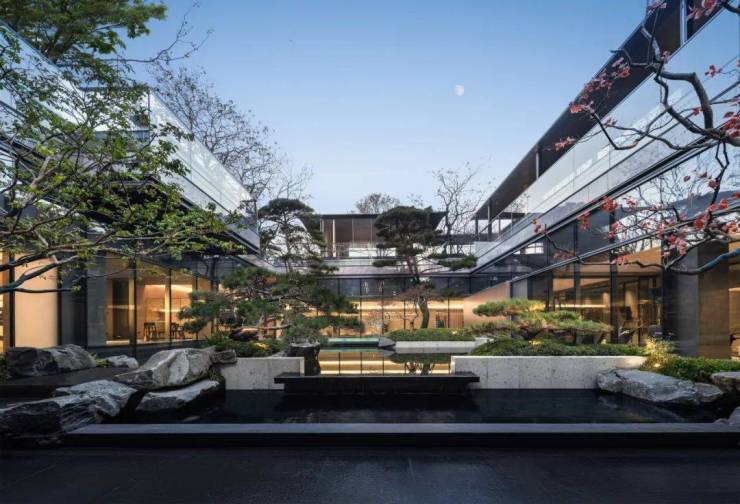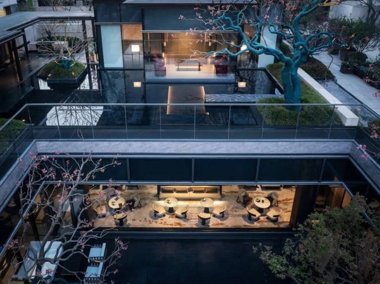 穿过会所来到尽端,落座于古琴两侧,观镜水微波,乌桕的倒影摇曳;与远处的伫云亭遥相对望,开启一场无言流动的遐思,寻味文人桕下抚琴的妙趣。