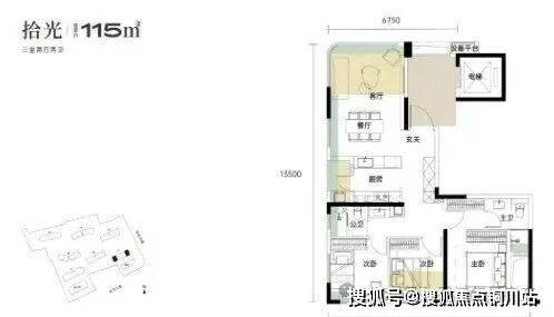 建面约115平的边套三房:分布在1号楼端头边户,3个卧室朝南,餐客厅一体全景舱设计,带独立电梯前室。