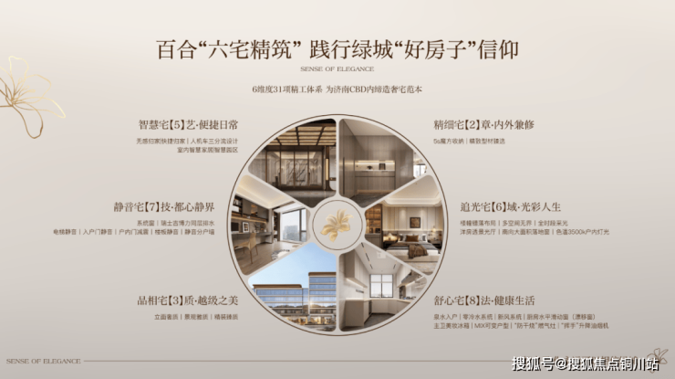 绿城百合系泉城首作──润百合定向研发“六宅精筑”体系,通过精细宅、静音宅、品相宅、智慧宅、追光宅、舒心宅等六大维度产品创新,为美好生活预设更多可能。