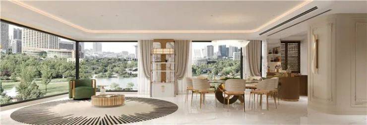 建面约158㎡户型的主卧套房实际空间约达33㎡,这个尺度能够实现当下五星级酒店套房最流行的洄游动线设计。