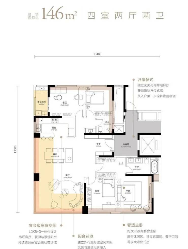 建面约146㎡户型的餐厅、客厅、阳台、花池等面积(LDKBG空间)共有约59㎡,也就是相当于60㎡。
