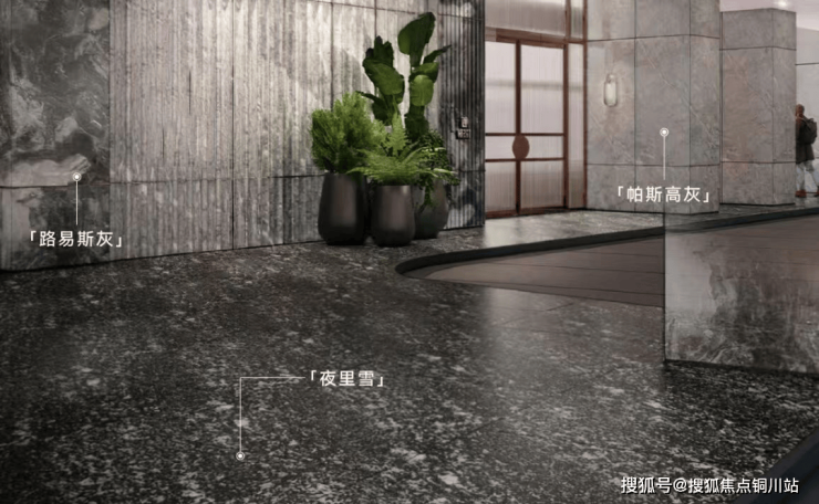 在细节表达上,以公区地下大堂为例,地面与墙面精选“夜里雪”、“帕斯高灰”、“路易斯灰”等珍稀奢石,精心雕琢每一处细节,勾勒高阶质感生活。