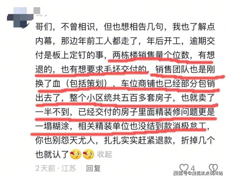 评论区也有称了解内幕的人爆料:“两栋楼销售量个位数,有想退的,也有想要求毛坯交付的,销售团队也是刚换了血,车位商铺也已经部分包销出去了,整个小区统共五百多套房子,也就卖了一半不到”。