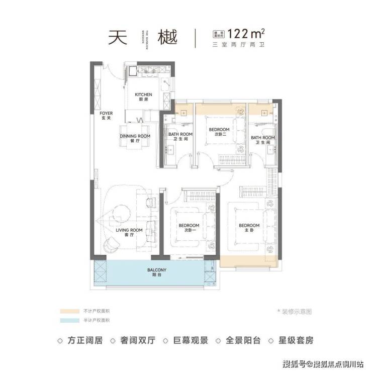 这是项目建面约122平的三房两厅两卫。
