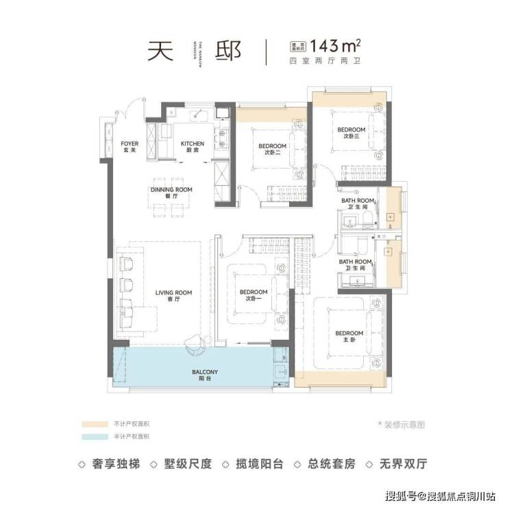 还有建面约143平的四房户型,