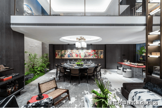 下叠入户门边上还预留了日常的 800 库,可满足日常的收纳。会客厅连通餐厅吧台,外拓至庭院,形成 15 米的延伸景致,将户外的光线与植被一并揽入其中,并与景观茶室围合为一体,打破空间的界限感,形成一个无边界的聚会场域。