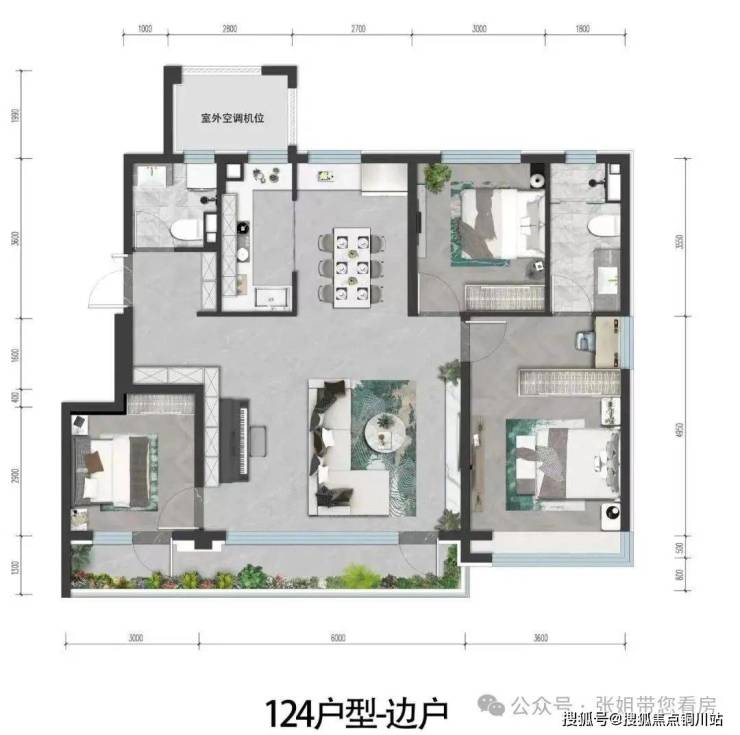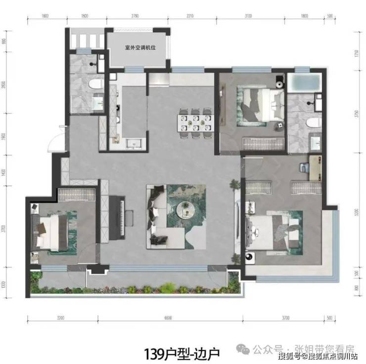 124㎡和139㎡户型:布局相似,客厅轴线开间分别约6米和6.6米,搭配超尺度落地窗和开敞式阳台,玄关为二进式(之)字型动线,收纳能力强。