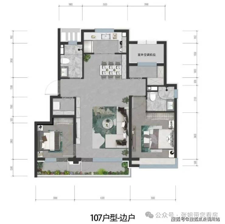 94㎡和107㎡户型:布局基本一致,三开间朝南,入户门旁设有独立家政间,可安装洗衣、烘干机等,餐厨为贯通式布局,餐厅侧面预留餐边柜空间。