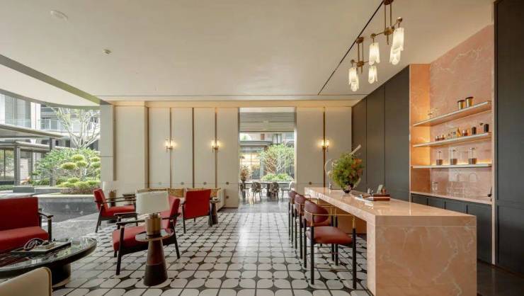 若说连廊是生活的脉络,那12座雅奢花园便是麓里的花漾剧场。从立春的山樱花到冬至的腊梅,麓里用24节气的植物系统,把自然教育种进了日常。此次惊艳绽放的四季酒店式漂浮会客厅,约13米挑空品鉴吧廊,香奈儿经典格纹星光吊顶演绎奢境美学;180°环幕水境,营造媲美华尔道夫酒店的沉浸式景观。生活于此会客闲谈,赏景放空,每一刻都是酒店式度假的奢适享受。