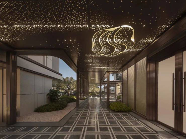 归家即度假,酒店式归家礼遇,从步入社区第一步开始。社区大门以Prada绿奢石入境,天然石材的深邃纹理与金色格栅交织,如同一幅流动的山水画卷,让每一次归家都如踏入五星级酒店,诠释出入皆礼遇的豪宅配置。