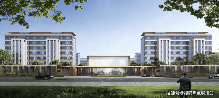 远远看去,被项目的建筑美学吸引!经典三段式立面,石材、铝板、一体板材质,高级灰与仿铜配色,大面积中空LOW-E玻璃,通透轻盈,豪奢尽显。