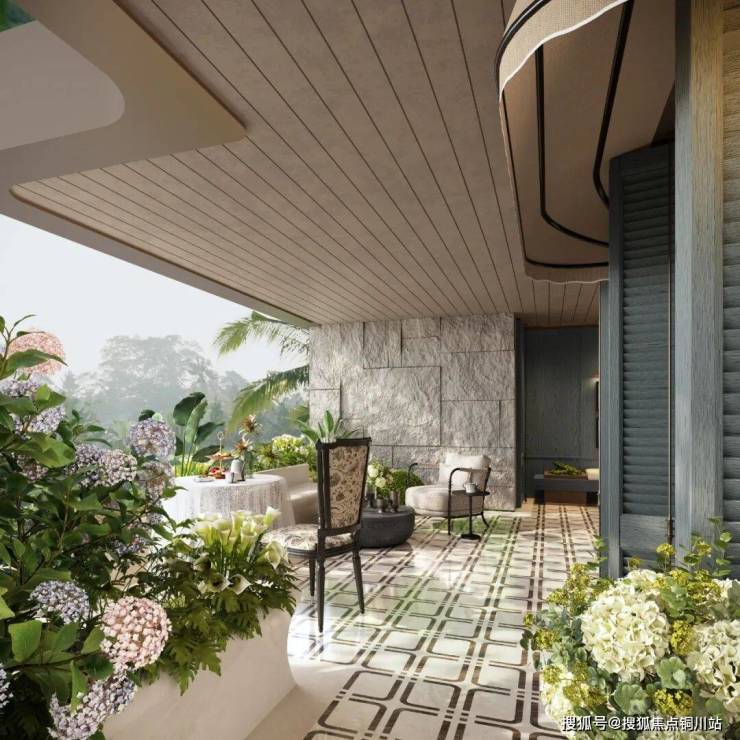 除南向瞰景阳台外,约38㎡的北向平台,项目将其分为三大模块——户外社交区、精神天地区、家政区。