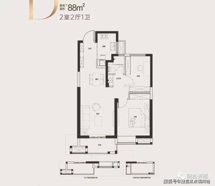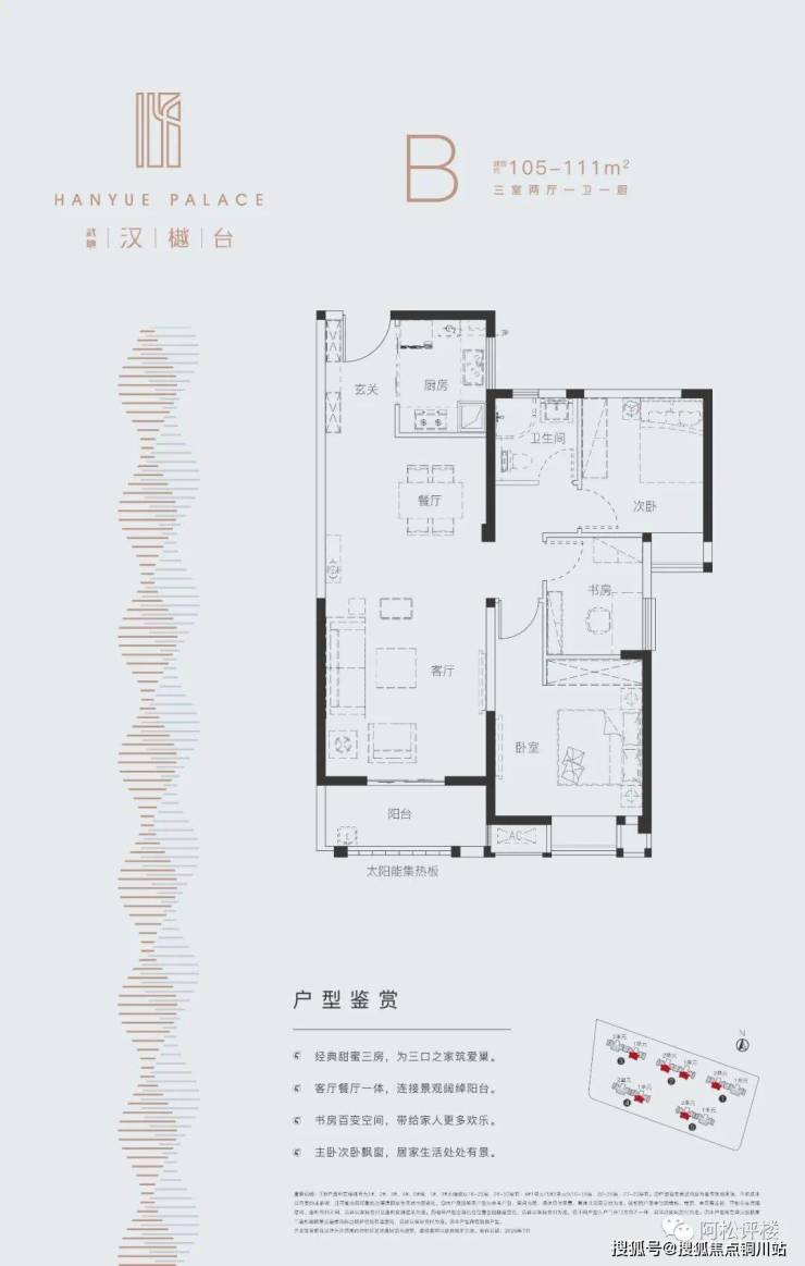 建面约105-110平 三房两厅一卫:中间套,2.5开间朝南,书房朝东或西,实际上为纯南不通透户型,只有一个卫生间,功能性略显不足。