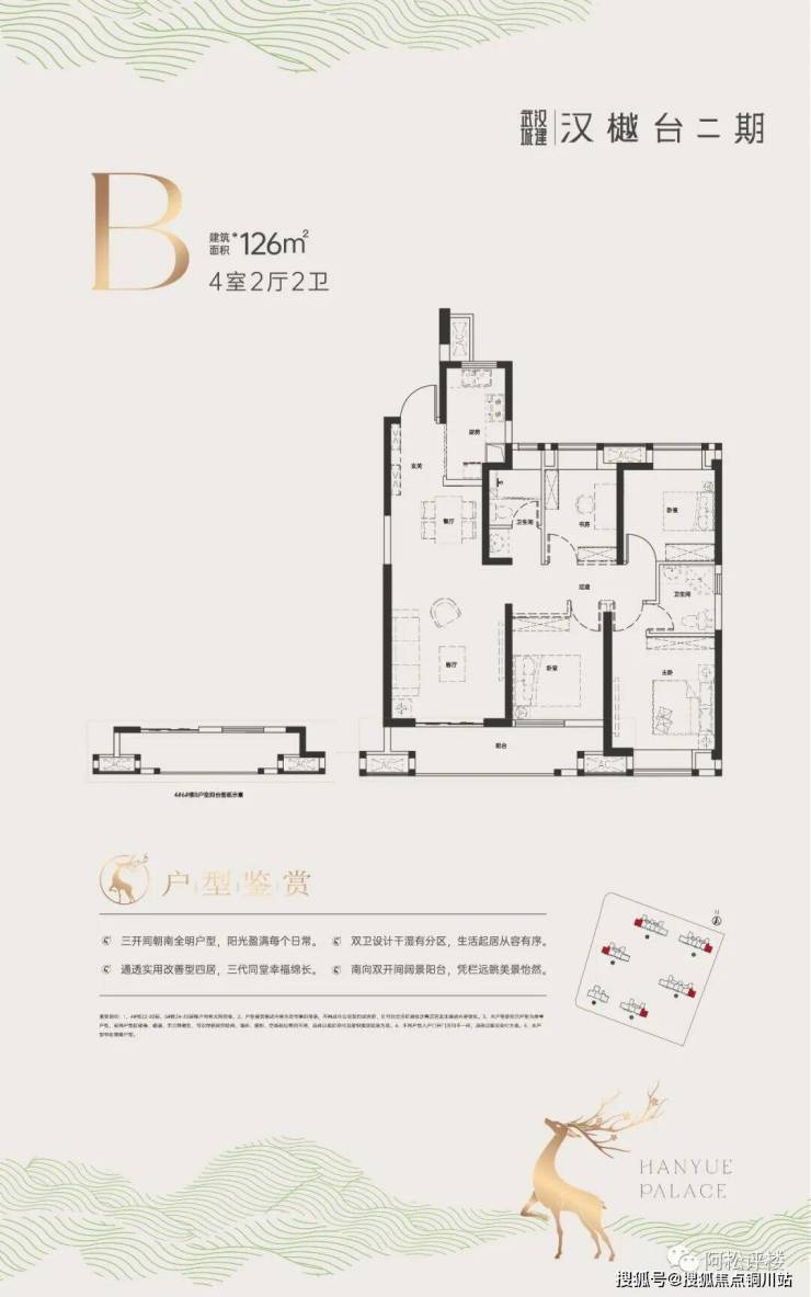 建面约126㎡ 四房两厅两卫:边户,三开间朝南,户型方正,南北通透,动静分区,主卧带独立卫生间,南向超大阳台,近二环,仅126㎡户型就能做四房,功能性强大。