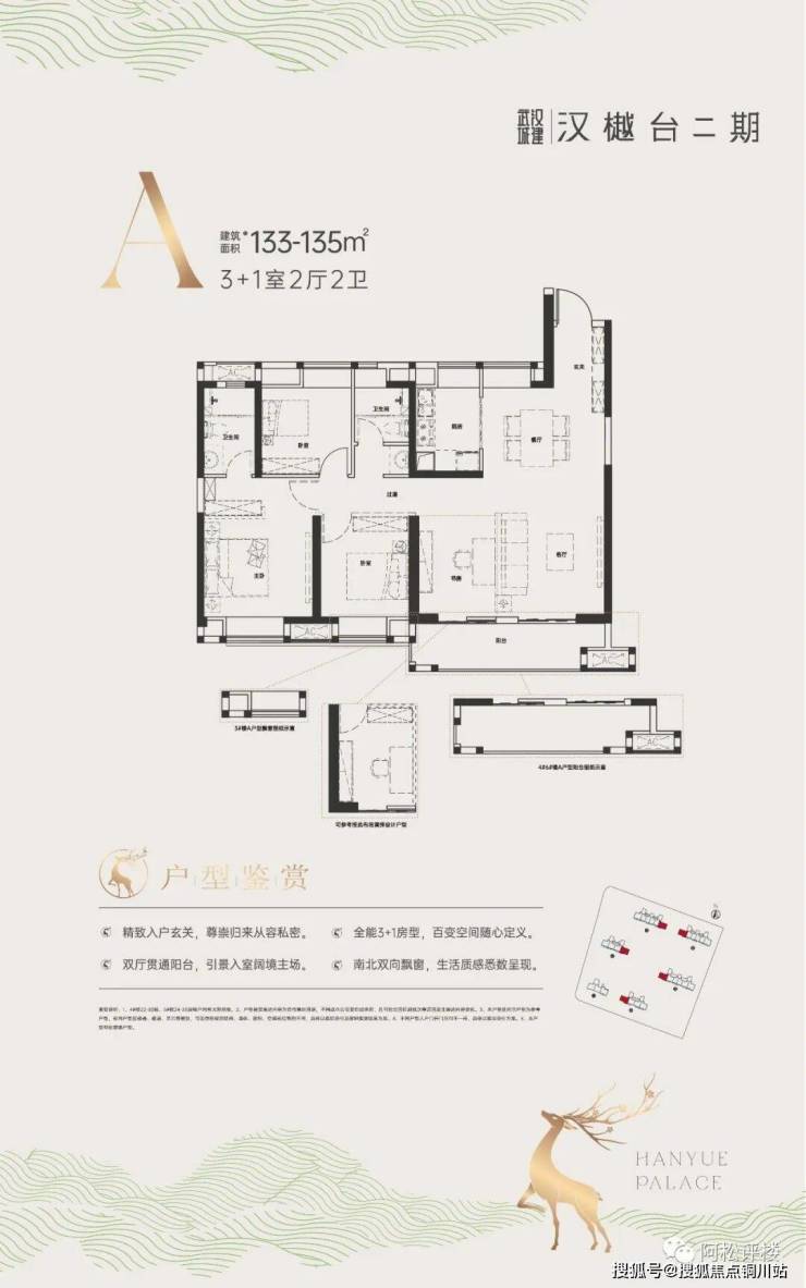 建面约133-135平 3+1房两厅两卫:边户,上面两个户型有的优点它都有。如果需要四房功能性,这个房就可以变为四开间朝南的四房,如果追求空间尺度和阔绰感,可以做大开间的横厅大三房。