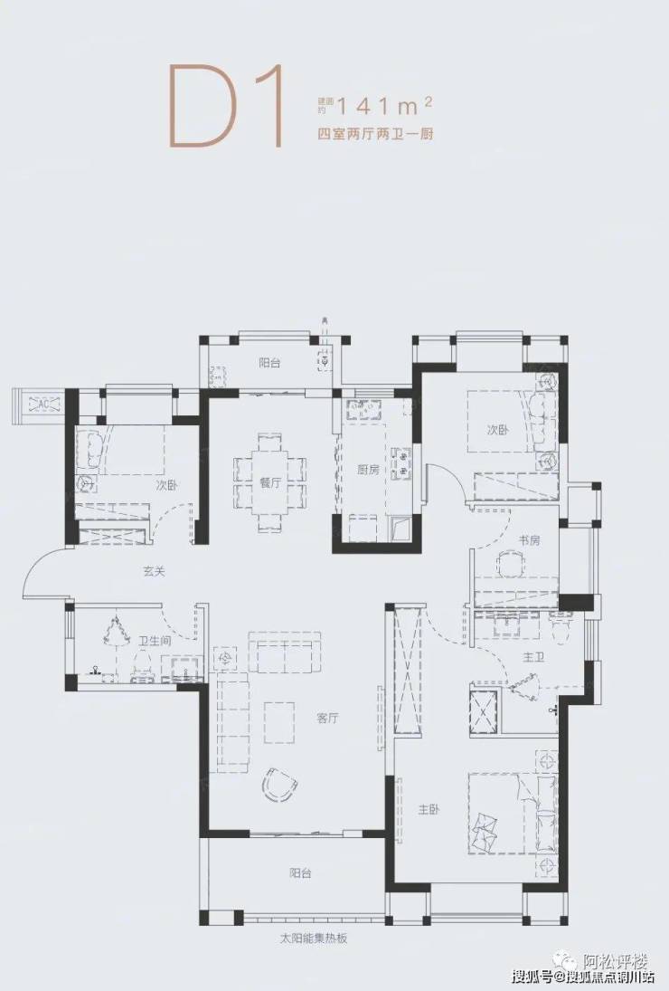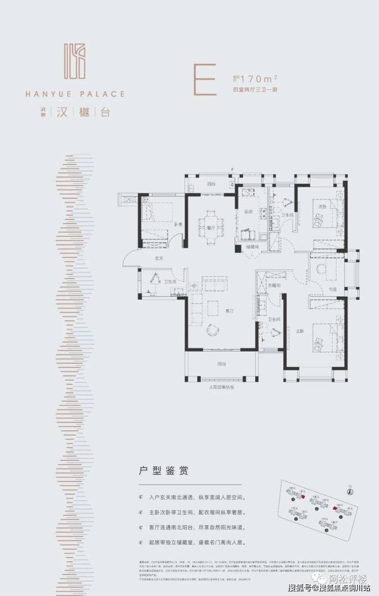 建面约170平 四房两厅三卫:东边户,两开间朝南,三面采光,南北通透,主卧是带衣帽间和卫生间的套间,甚至可以书房囊括其中做成独立套房,南北双阳台,不过这个户型走廊很长,会有一点浪费面积。
