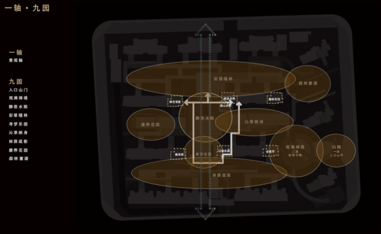 社区园林景观打破了传统的围合式江南园林打造理念,运用苏州园林的经典元素,打造一轴九园的布局。