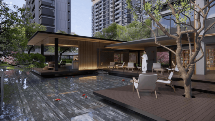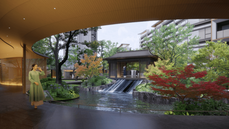 将古典园林和现代建筑融合,形成内外交融、有密有疏,顺应自然,曲径通幽,移步异景的全新江南园林。