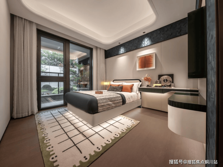 在转角窗侧可以放一张沙发+落地灯,或增加一张床尾凳,整体居住体感很接近星级酒店的豪华套房