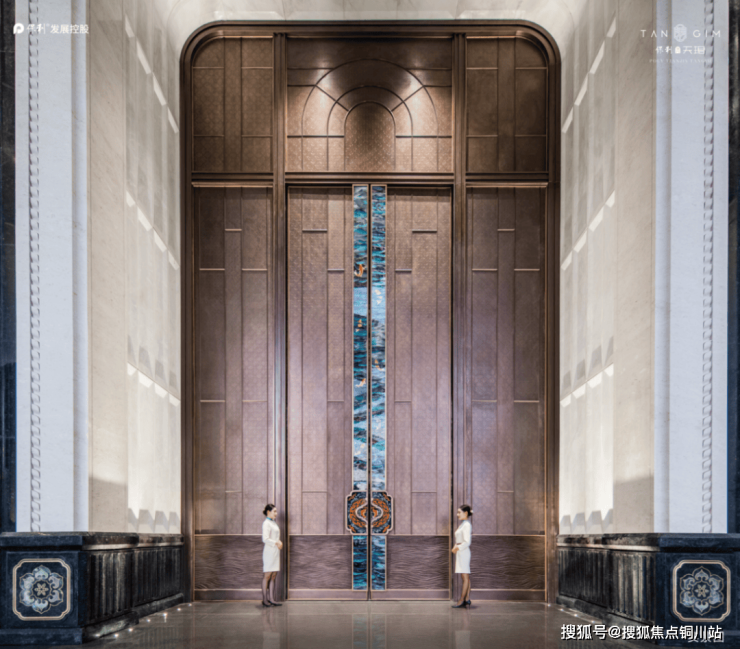 项目光之门的顶部设计形制来源于皇家华盖,将中国古式的藻井与西式的星光穹顶相结合,外部包裹的金属网,由3 万个金属环组成,由匠人师傅手工镶嵌而成,底部涌泉底座由奢石整体切割而成,雕刻了中国传统 12 个时辰以上下呼应,寓意幸福时光永恒。
