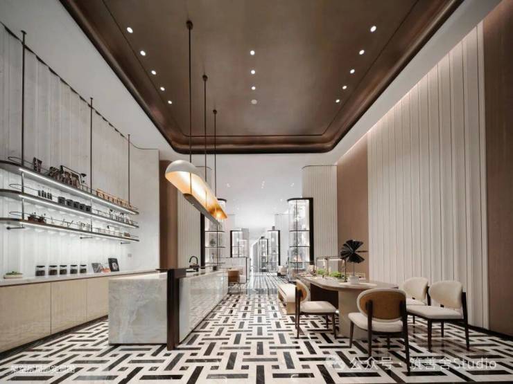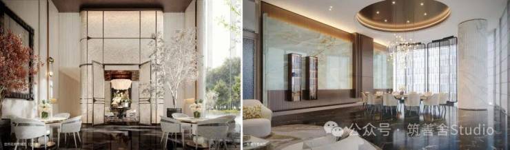 社区主入口横向展开面长达百米、高6米,参考酒店式入户设计,布置环岛落客区奢侈空间尺度。范思哲黑与安哥拉黑石材低调华贵,顶面千片鳞片造型似江浪灵动,百达翡翠原石与黄铜镶嵌而成“王冠之瞳”,整体空间奢华与优雅并存。