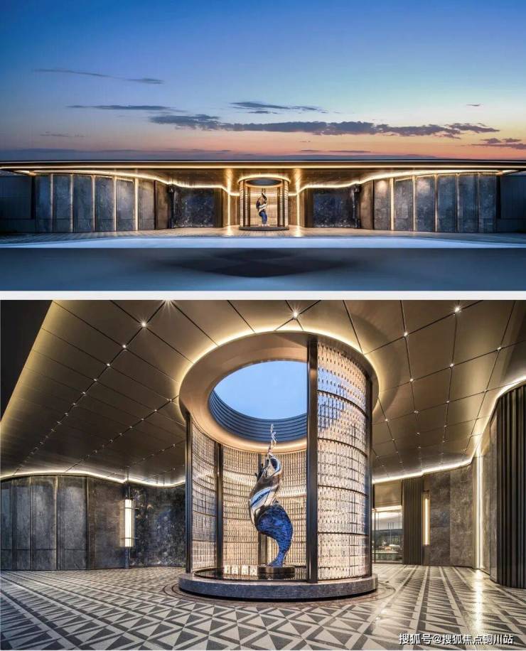 镂空铝板与玻璃幕墙构成“光影门廊”,搭配镜面水景,营造艺术馆般的抵达体验。