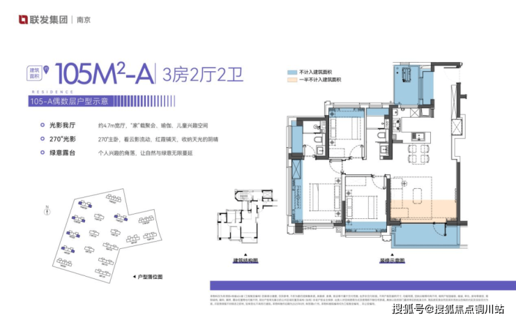 建面约105㎡三房两厅两卫,均为边户设计,客厅开间约4.7米;入户双玄关结合S墙设计,有效提升更多收纳空间;主卧拥有270°观景视野,空间感非常赞。