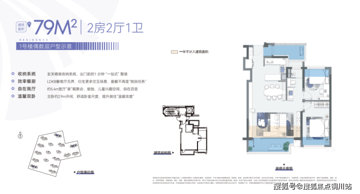 建面约79㎡两房两厅一卫,是建面约69㎡的再升级,带来更大的尺度空间、更丰富的场景延伸、更强的收纳空间。