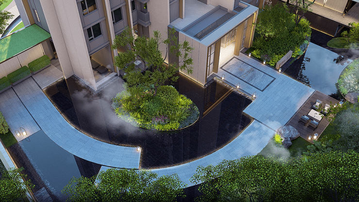景观设计上规划了地面花园,架空花园,屋顶花园等多重园林景观,实现全方位、立体式园林效果,让社区居民更好的融于自然。