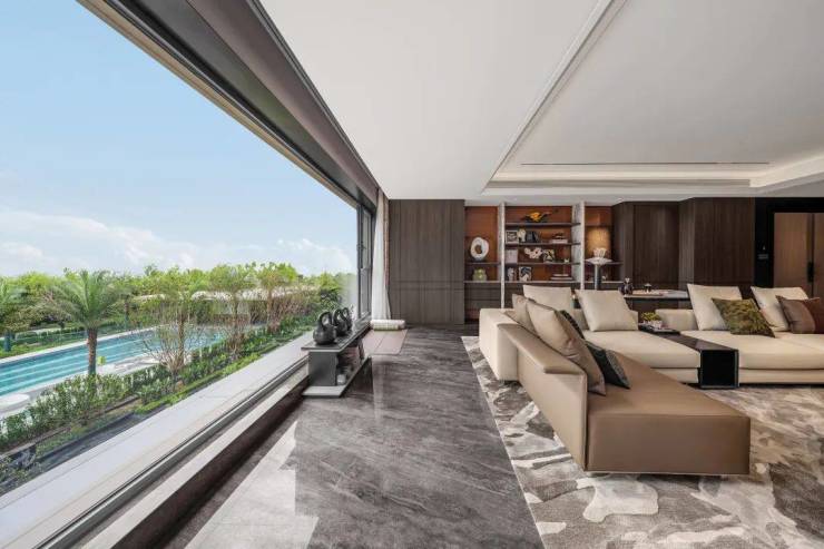它也不像别家单一泳池外围加个草坪就结束了,而是细分为戏水池、浅水区、深水区,浅水区铺设防滑石材,专为儿童设计安全嬉戏区。泳池周边采用隐形式玻璃护栏,既保障安全,又不打断视野的连贯性。