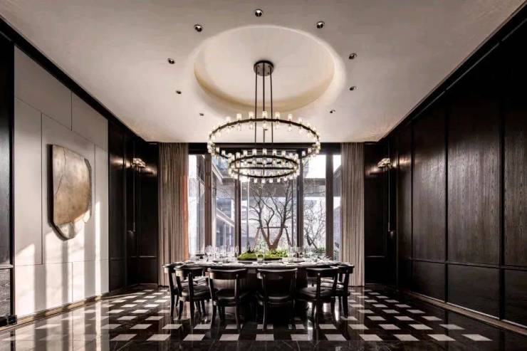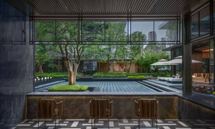 叠影之庭——设计灵感源于“江中晨雾”的层次感,在庭院中央孤植一棵迎宾姿态的乔木。江面泛起的涟漪被抽象为层层叠级的水台,各异的水面高差映衬出错落有致的树影。庭院因此得名“叠影”。